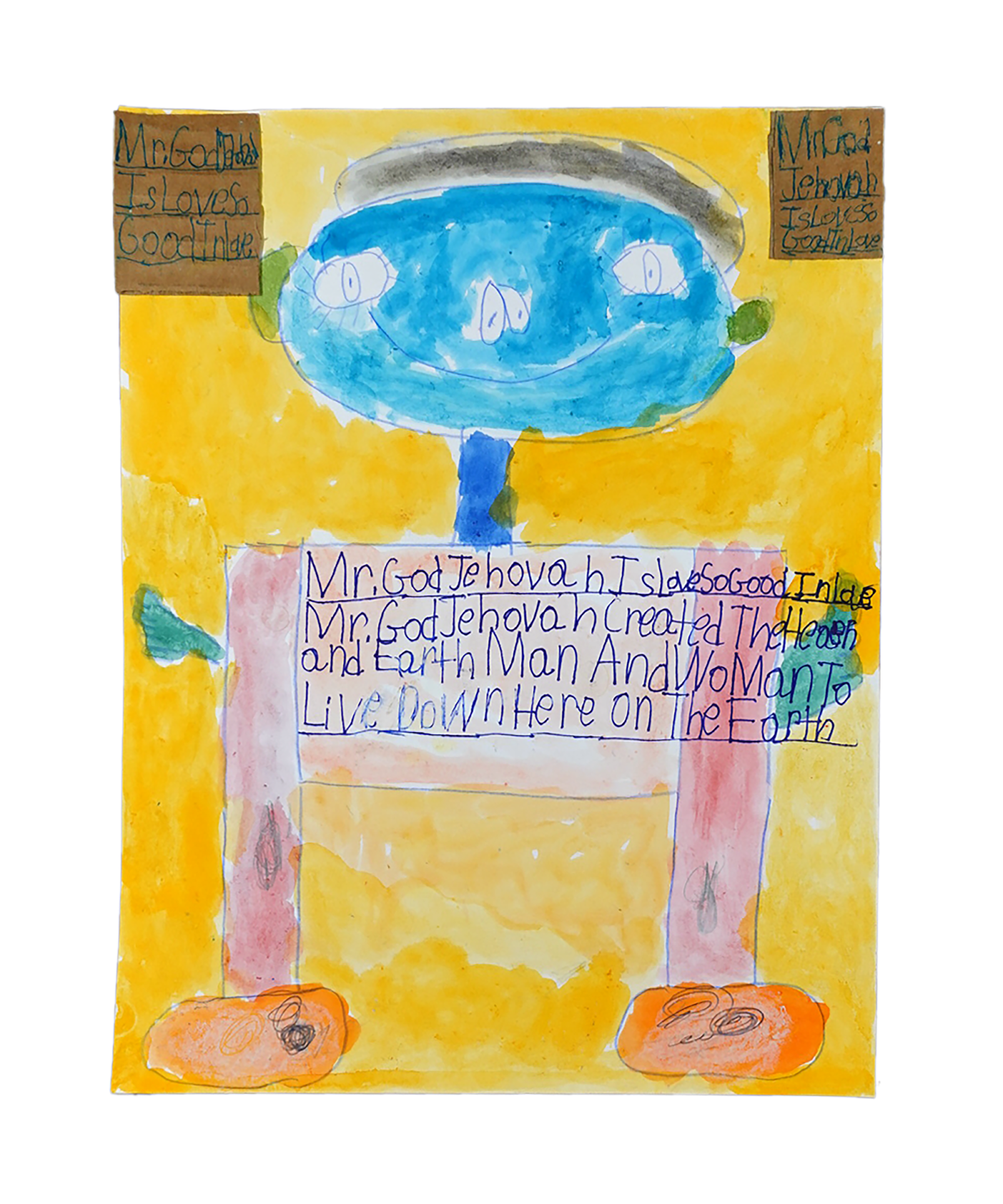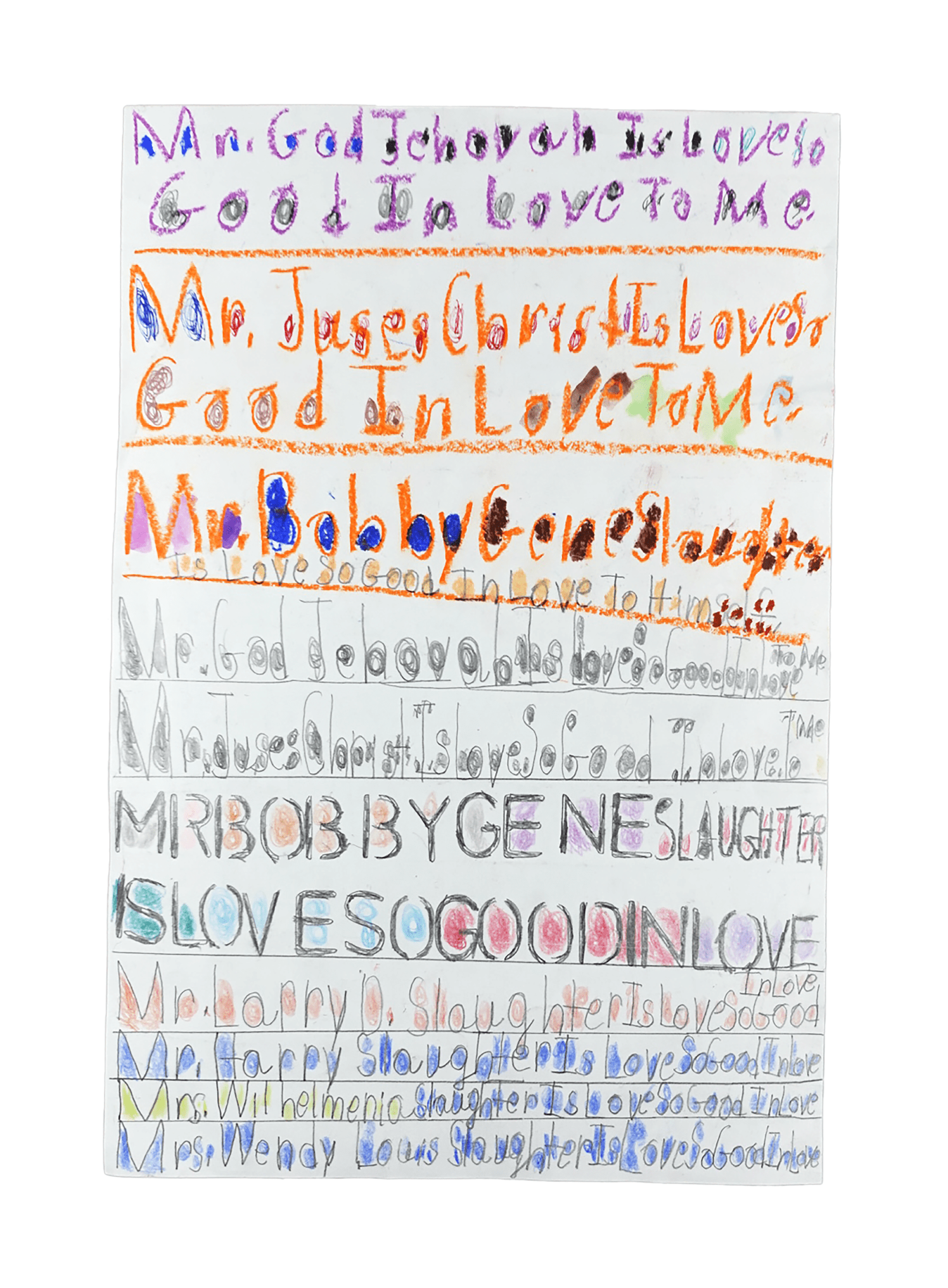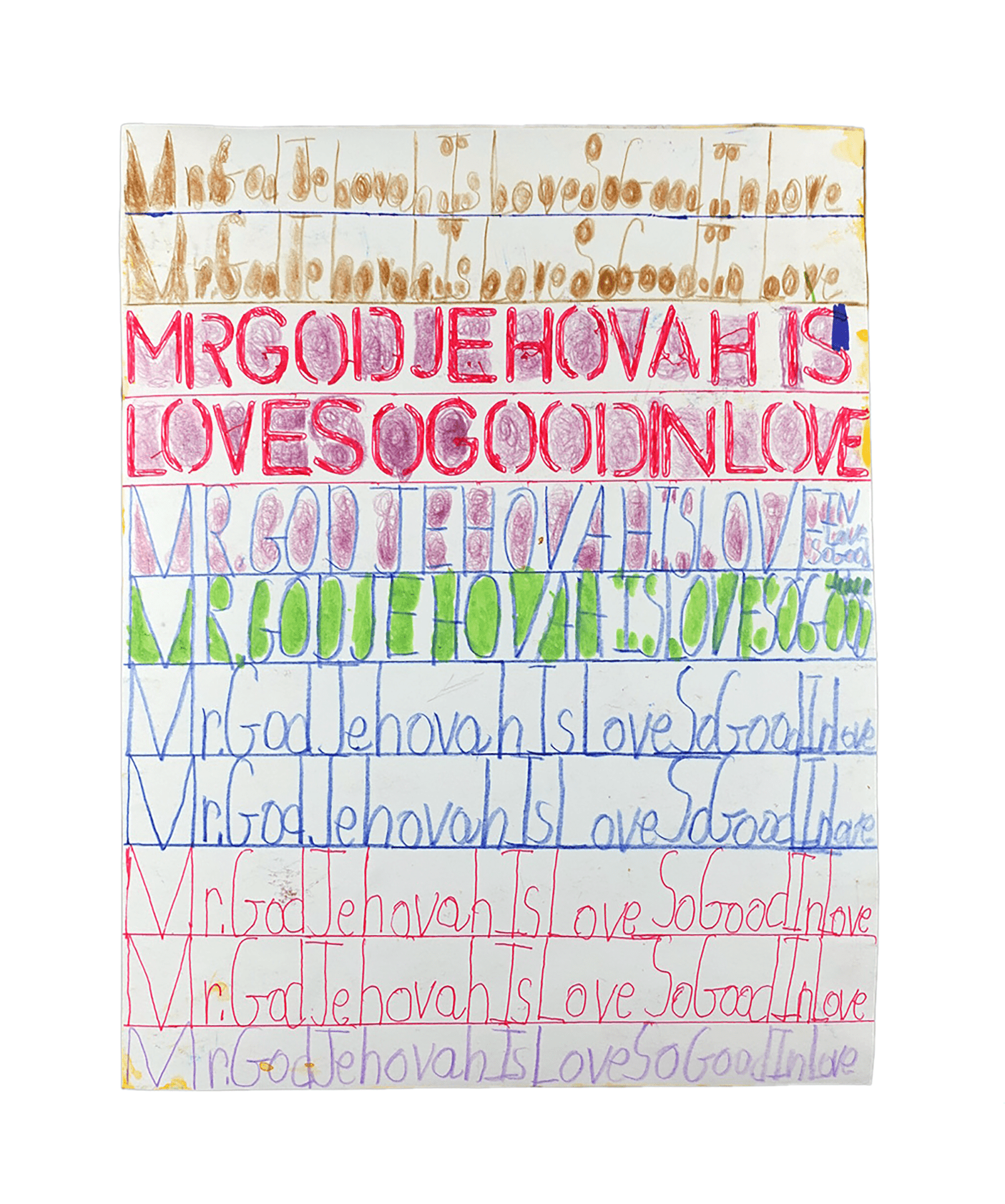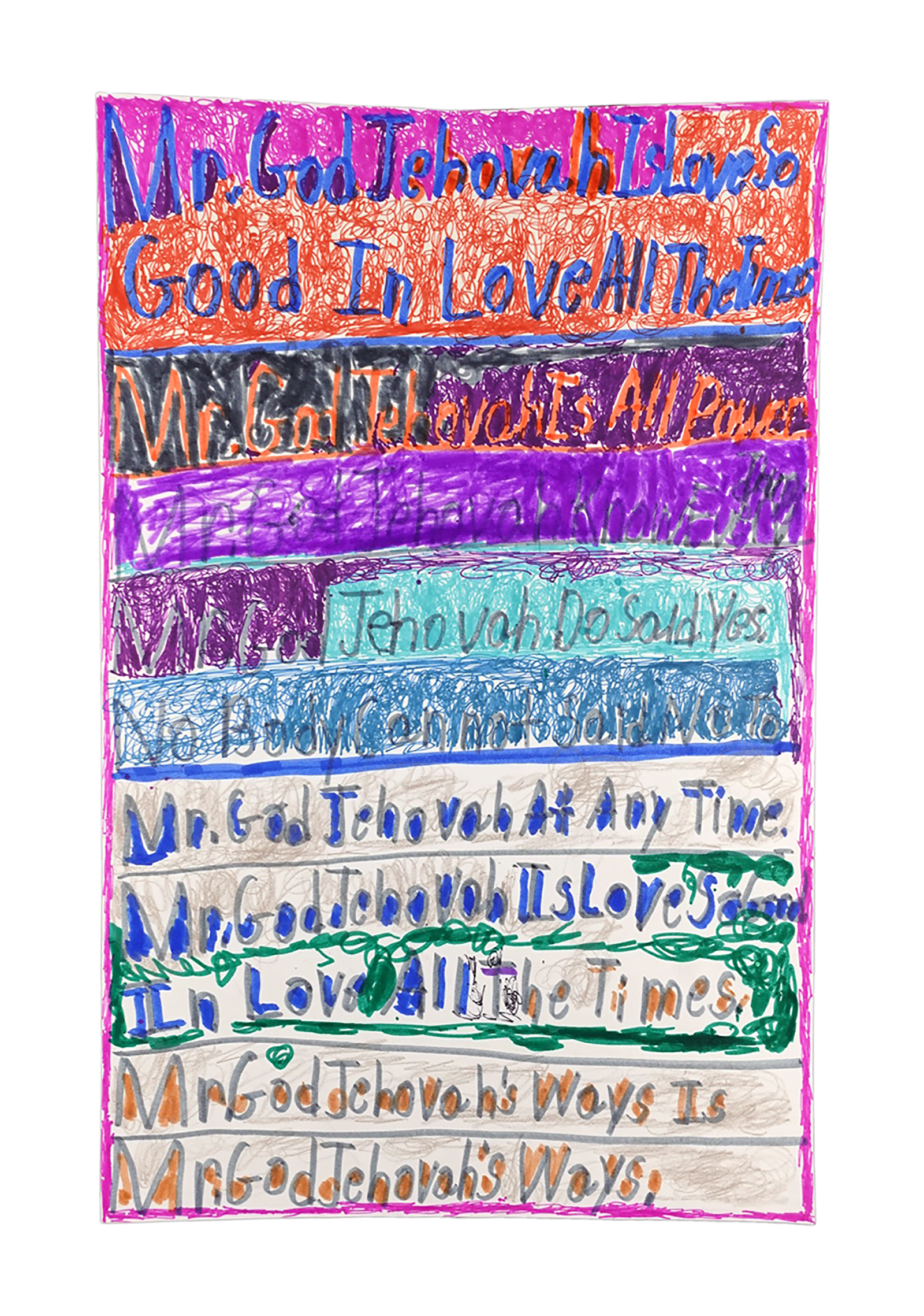 Bobby Slaughter (b.1961) is a self-taught artist from New York. His work centers around religion, featuring Jehovah as the subject of many of his pieces. He writes the phrase, “Mr. God Jehovah Is Love So Good in Love,” and variations of this multiple times on nearly all his pieces. Bobby utilizes stencils in his work and has recently been experimenting with layering tracing paper. He revisits old pieces often and continues to elevate his own work.