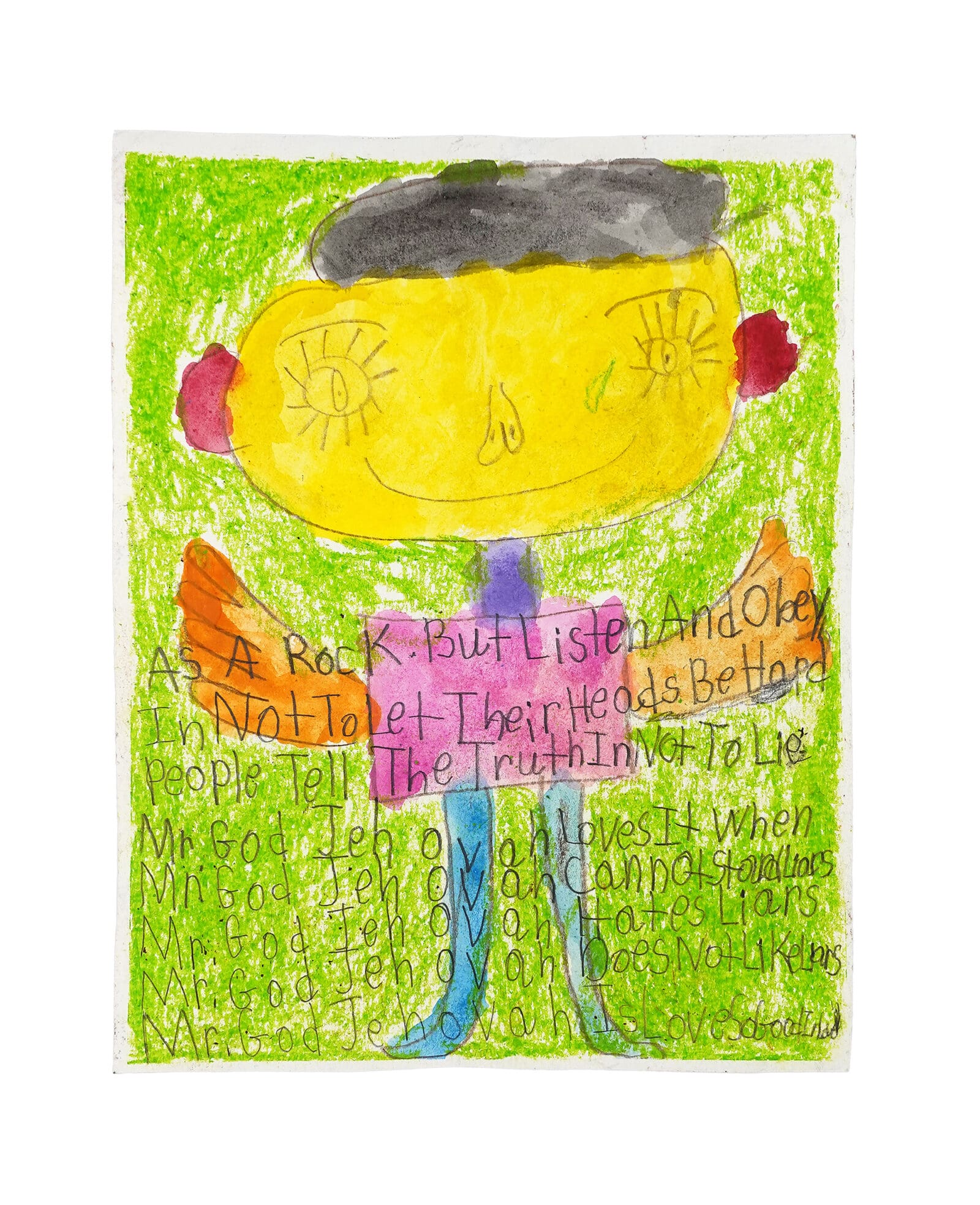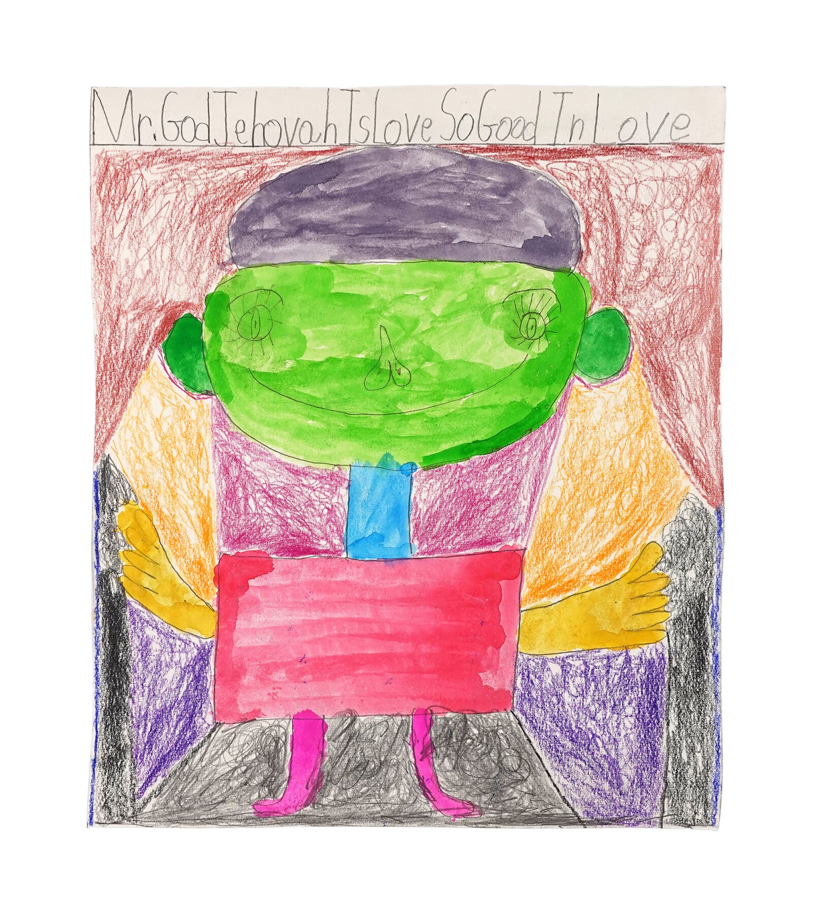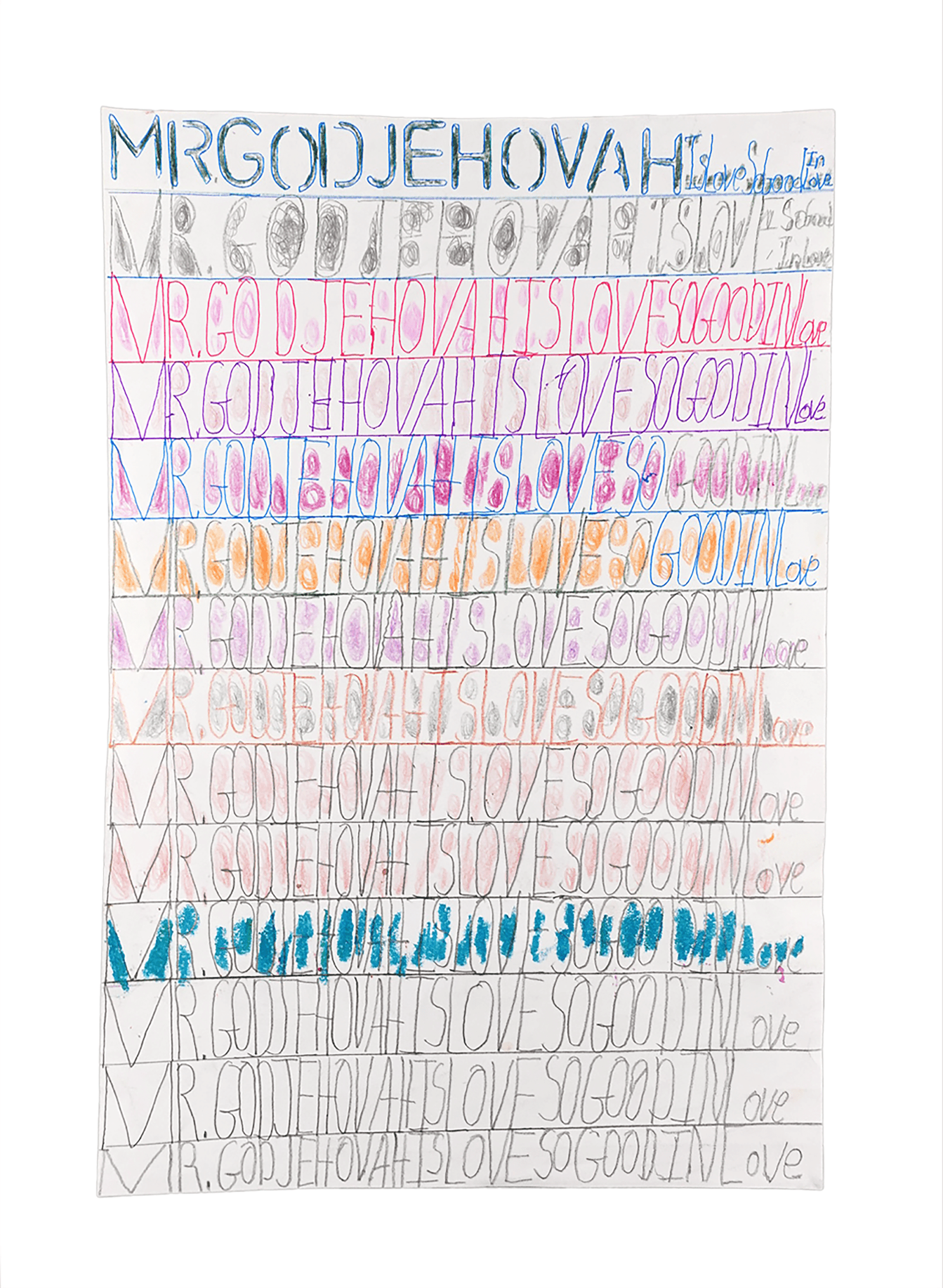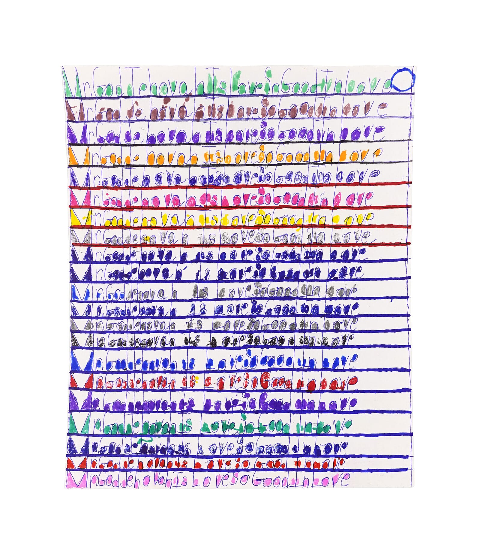 Bobby Slaughter (b.1961) is a self-taught artist from New York. His work centers around religion, featuring Jehovah as the subject of many of his pieces. He writes the phrase, “Mr. God Jehovah Is Love So Good in Love,” and variations of this multiple times on nearly all his pieces. Bobby utilizes stencils in his work and has recently been experimenting with layering tracing paper. He revisits old pieces often and continues to elevate his own work.