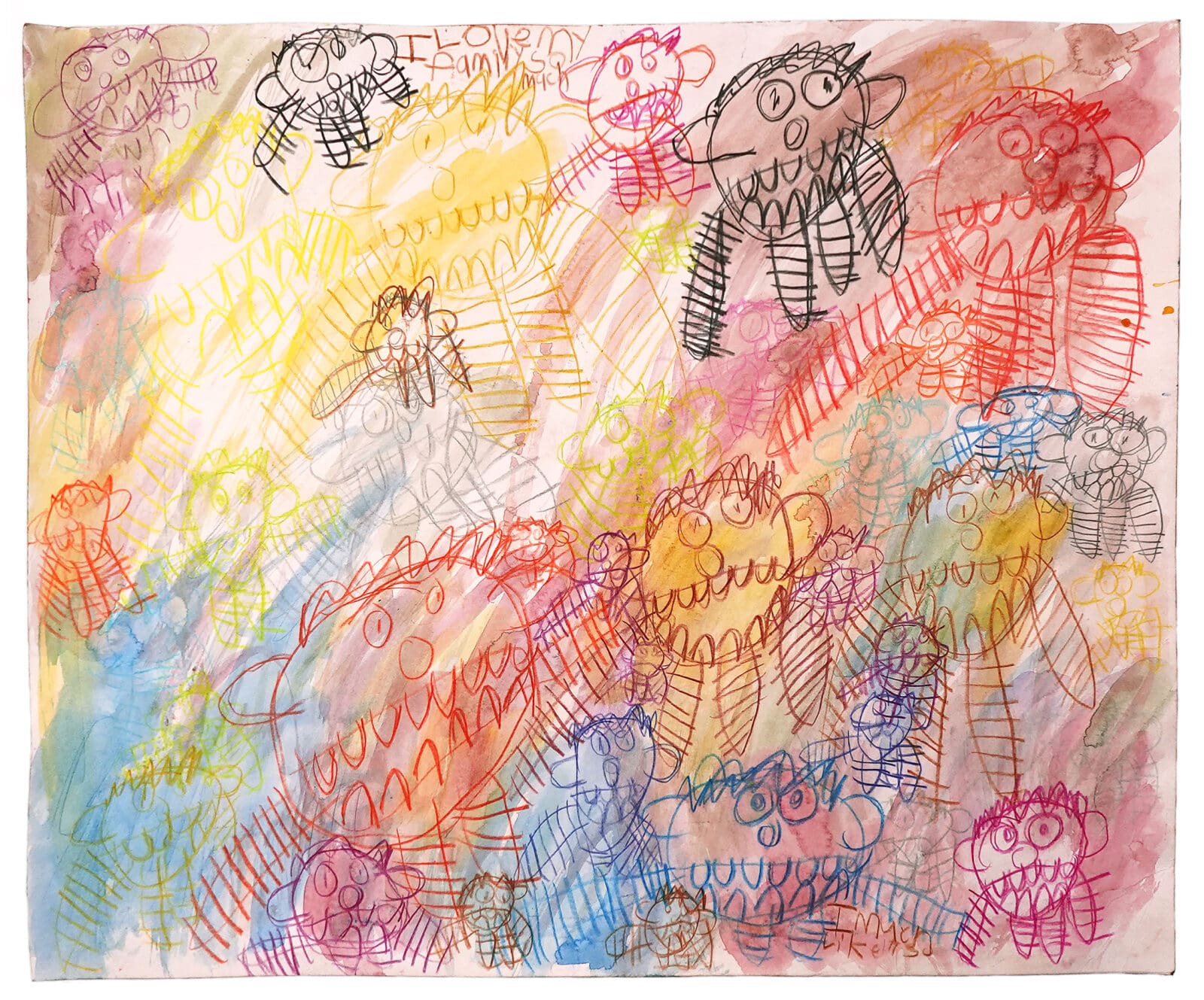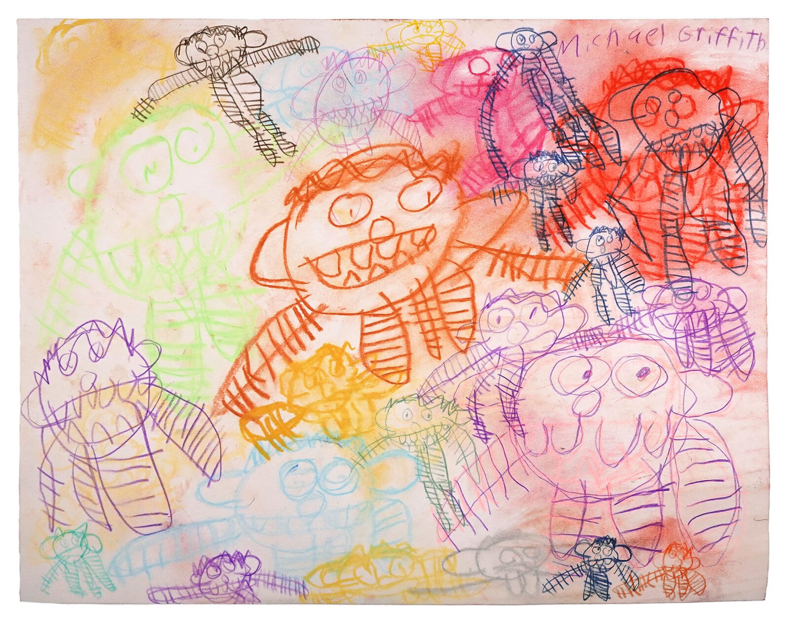 Michael Griffith (b.1971) is a self-taught artist based in Brooklyn. Drawing inspiration from his own life, Griffith reimagines his family, his neighborhood, and his favorite tv shows and films through abstract depictions. Griffith uses a combination of watercolor, colored pencils, pen, marker, acrylic markers, and pastels to create layered compositions full of depth and vibrancy. His work often incorporates his favorite phrases and quotes weaving in an expressive element to the visual experience of his work.