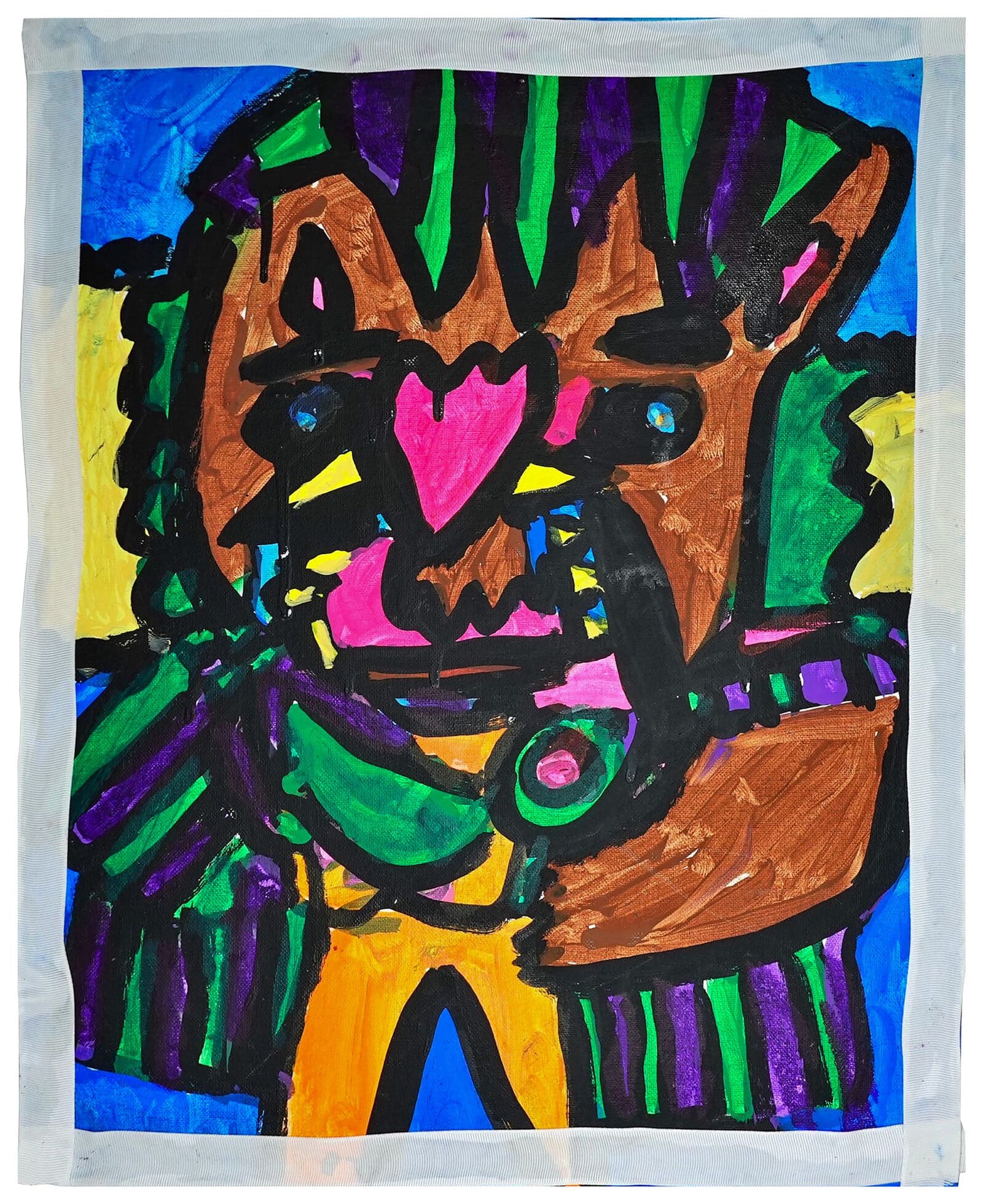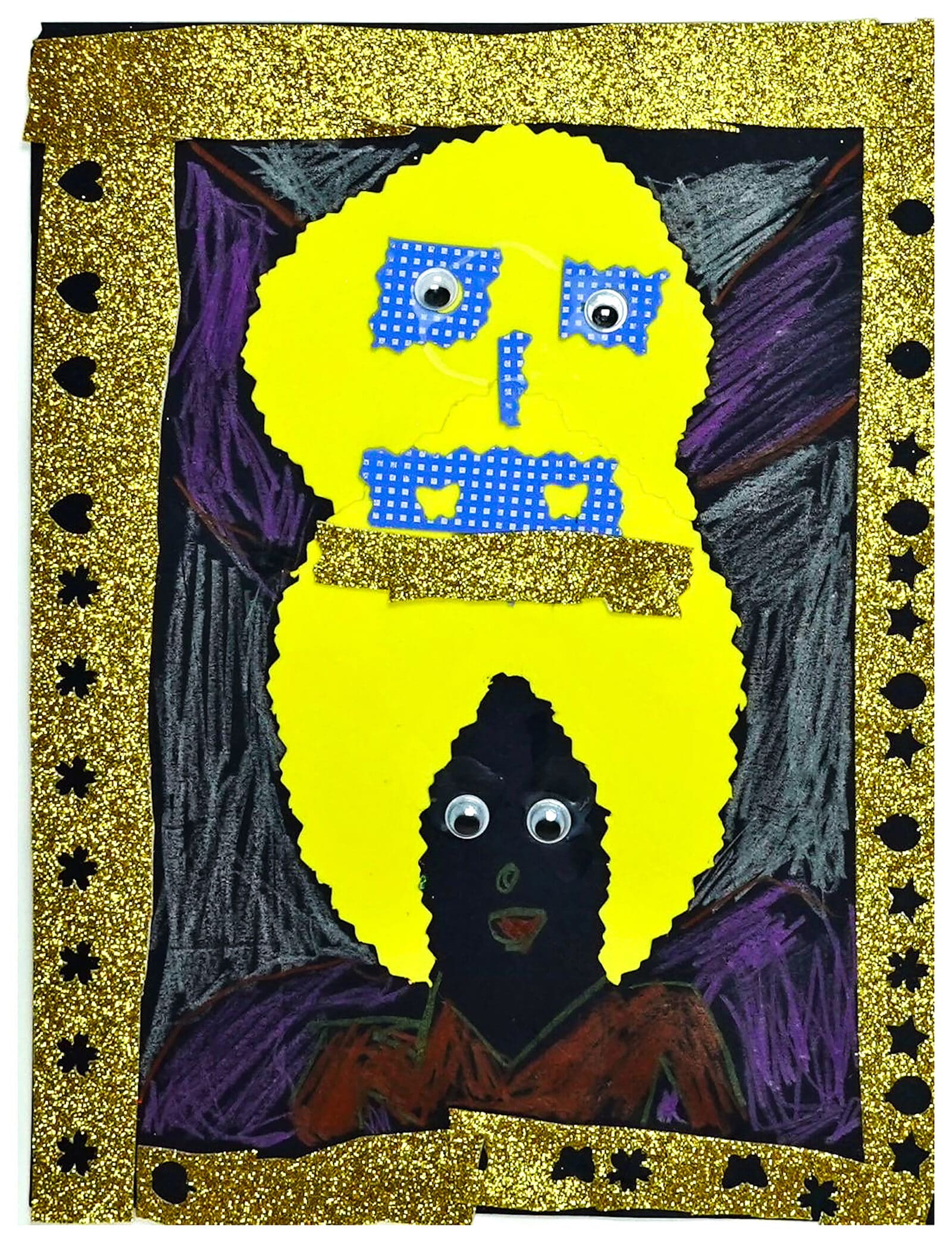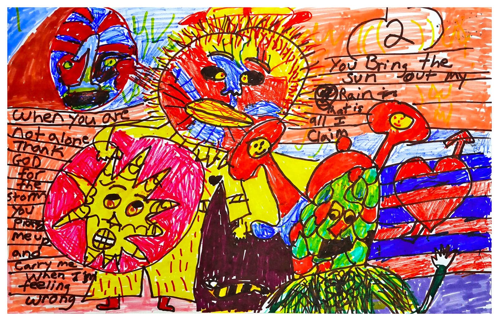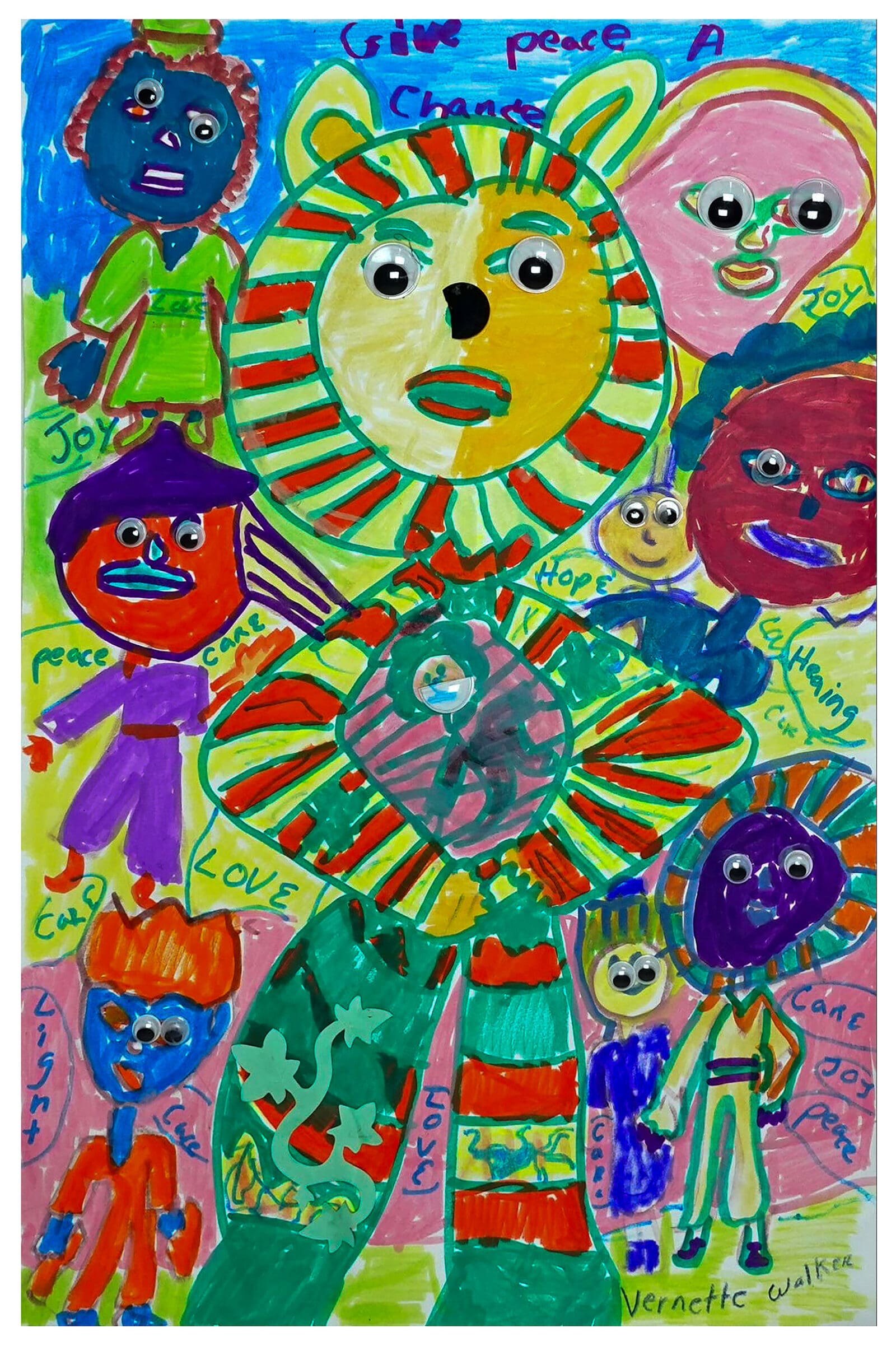 Vernetta works across mediums, utilizing any material she can find. When working on paper or canvas, she gravitates toward acrylic markers, but enjoys experimenting with water-based markers, acrylic paints, oil pastels, colored pencils, micron pens, and more. She brings her whimsy to each work, often utilizing craft materials such as stickers, ribbons, and googly eyes. Her textile work is just as dynamic; her latest works being a series of colorful pillows.